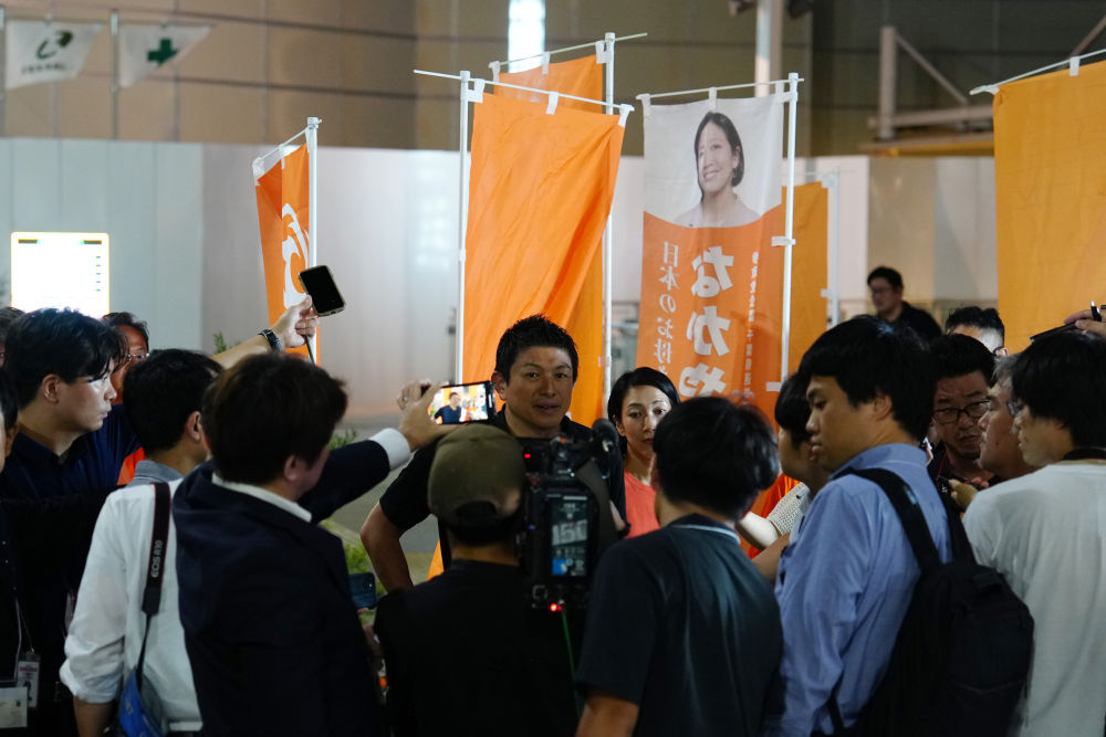 7月13日,在日本千叶县,参政党党首神谷宗币(中)在街头演说行动后继承媒体采访。新华社记者贾浩成摄