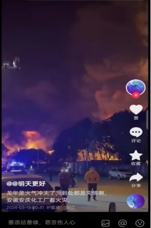 2024年3月18日,网民张某在某短视频平台发布失火视频,称“龙年是火气冲天了,到处齐是灾情啊,安徽安庆化工场着失火”。经核实,此视频失火发生地不在安庆,系流言。现在,安庆警方已照章对该张给予行政解决。